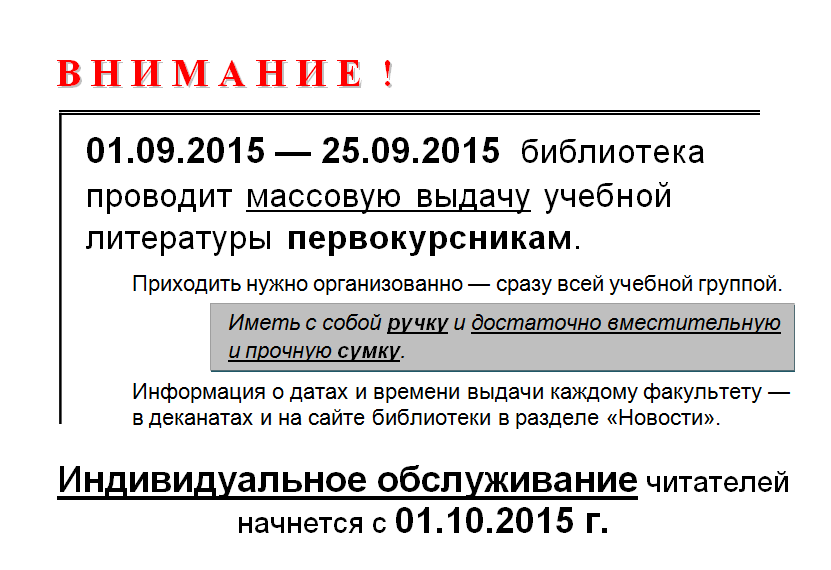 Напоминаем Вам о том, что по окончании текущего семестра (до 15 июля) необходимо сдать в библиотеку всю учебную литературу, пройти перерегистрацию и продлить читательские билеты.