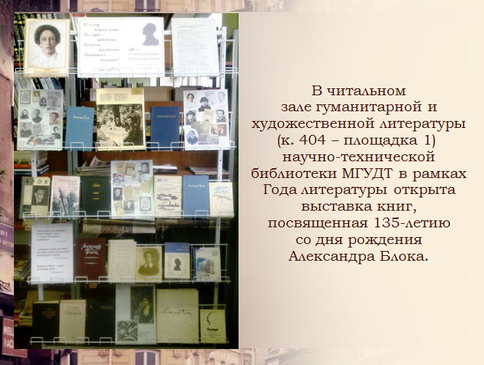 В читальном зале гуманитарной и художественной литературы (к. 404 – площадка 1) научно-технической библиотеки МГУДТ открыта книжная выставка, приуроченная к этому событию. На выставке представлены книги, учебники, монографии и журналы по дизайну, архитектуре, искусству костюма, обуви, текстилю и рекламе, материаловедению, производству нетканых материалов, аспектам продукции текстильной и легкой промышленности.