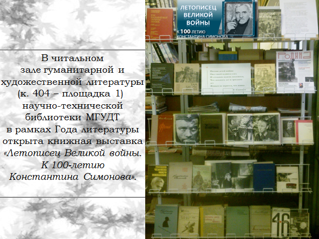 В читальном зале гуманитарной и художественной литературы (к. 404 – площадка 1) научно-технической библиотеки МГУДТ открыта книжная выставка, посвященная 70-летию победы в Великой Отечественной Войне 1941-1945 гг.