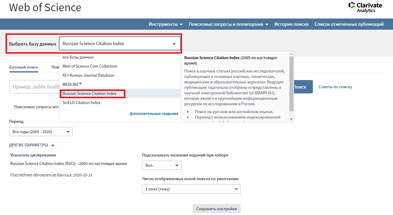 Для получения доступа нужно зайти на платформу Web of Science и выбрать Russian Science Citation Index из списка доступных баз данных.