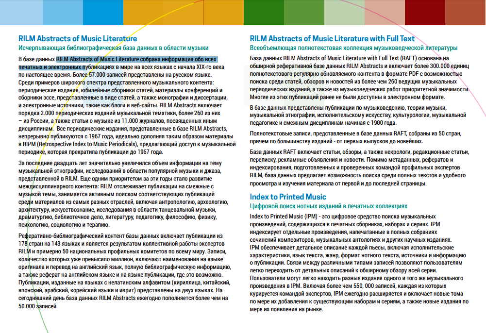 Реферативно-библиографическая база RILM с возможностью удобного поиска по регулярно обновляемому полнотекстовому содержанию.