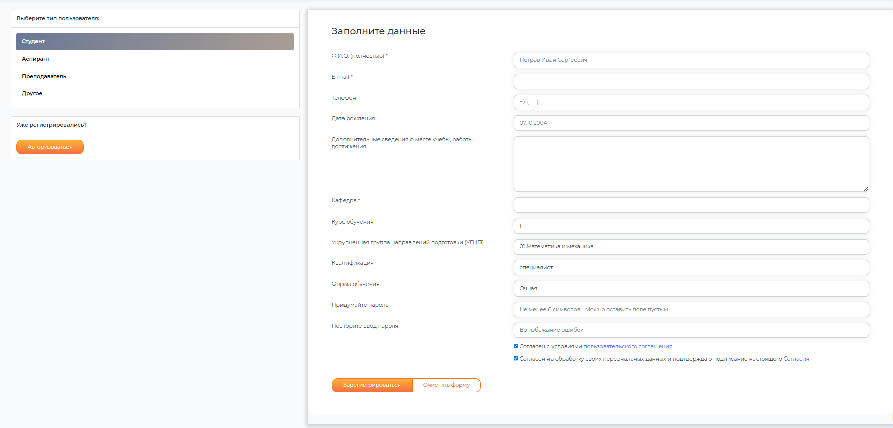 Для прохождения персональной регистрации выберите слева соответствующий тип пользователя и заполните все необходимые поля открывшейся формы. В конце нажмите кнопку "Зарегистрироваться".